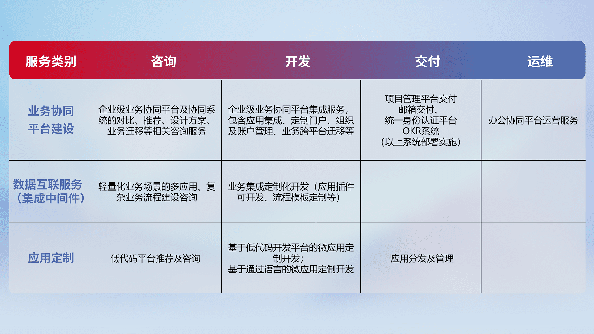 针对钉钉、、、、企微、、、、IDaas等平台级产品提供产品的规划、、、方案、、、交付、、定制化开发等服务,,,实现如统一协同办公、、、智能客户服务、、混合会议管理、、、、智能数据查询、、等业务场景,,,,实现数字化转型。。