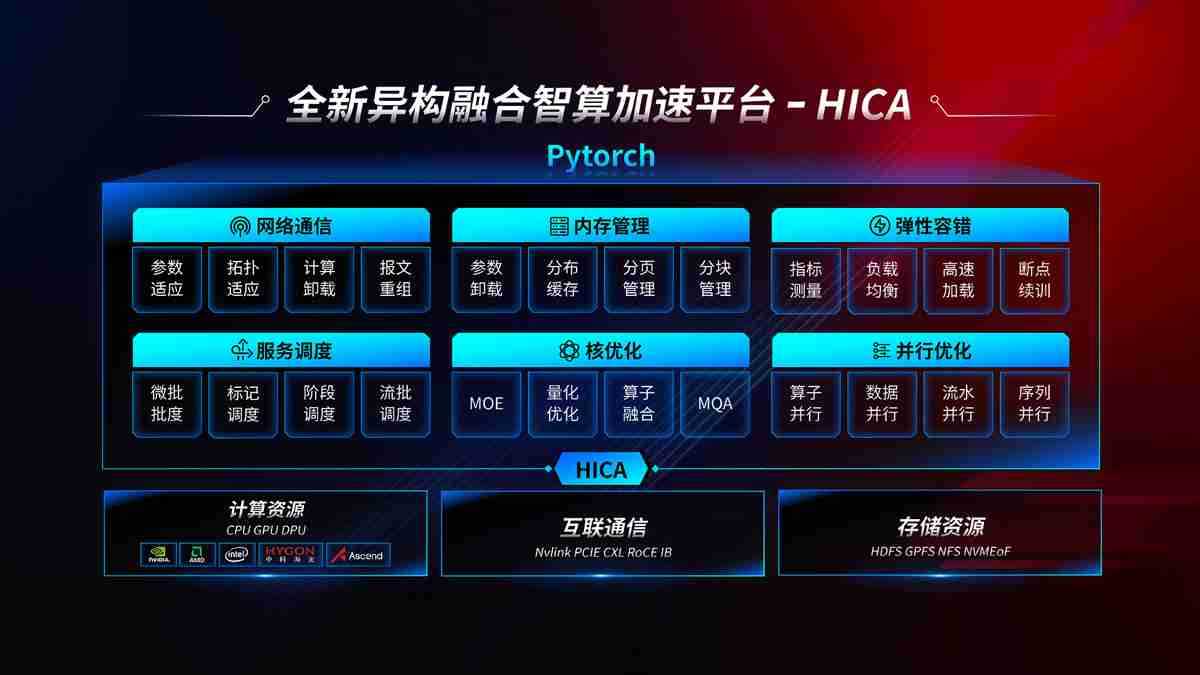 通过自研的服务层、、、中间适配层、、、以及调度编排算法,,采用数据并行、、、、模型并行等多种并行方式,,,把并行计算任务进行有效的分解,,,,使其分别由相应的软件栈和算力资源来承接。。。当GPU资源变化,,,,HICA可以实时动态调度计算子任务并调整模型拓扑和架构,,以充分聚合各种算力资源。。。。
